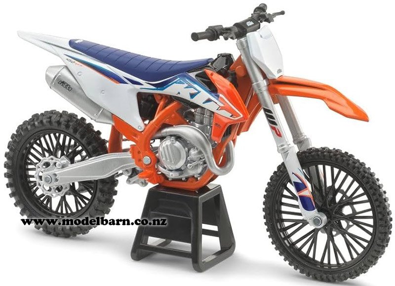 1/12 KTM 450 SX-F Motorbike. Made by NewRay. Features steerable front wheel. This motorbike is 180mm long, 66mm wide & 105mm high.