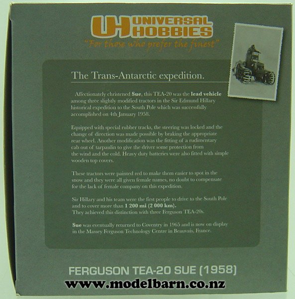On the 4th of January 1958 Sir Edmund Hillary, Derek Wright & Murray Ellis reached the South Pole. They were the first to do so overland since Scott in 1912, and the first to do it by Tractor. Affectionately christened "Sue", this TEA-20 was the lead vehicle. Equipped with special rubber tracks, they were steered by brakes on the rear axle. They were painted red to make them more visible in the snow, & were all given female names (to compensate for the lack of female company on the expedition).