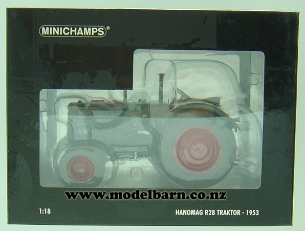 1/18 Hanomag R28 Tractor 1953. Made by Minichamps. Features steerable front wheels (not recommended though as are very fragile), precision detail. Does not attach to many implements. This tractor is 165mm long, 85mm wide & 118mm high.