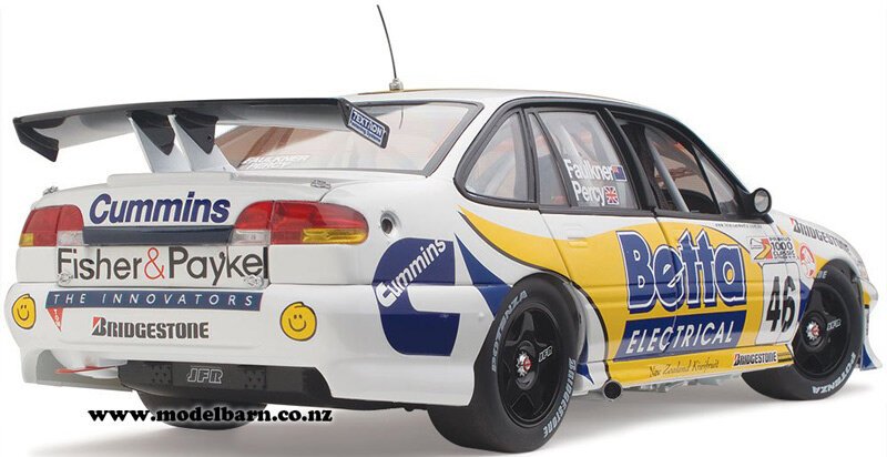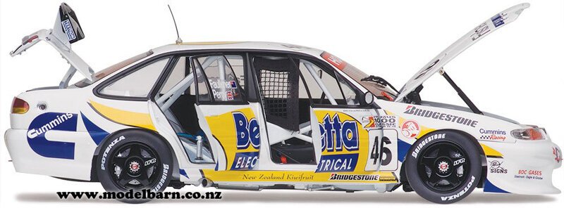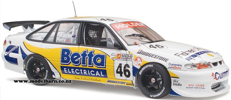 1/18 Holden VS Commodore Race Car. Made by Classic Carlectables. Features right-hand drive, opening bonnet, detailed engine, steerable front wheels, working suspension, opening doors, detailed interior, opening boot, precision detail. This is a replica of the "Betta Electrical" No 46 car driven by John Faulkner & Win Percey into 5th place at the 1997 Primus 1000 Classic at Bathurst. Only 400 have been made of this limited edition. Comes with Certificate of Authenticity. This car is 270mm long, 98mm wide & 100mm high.