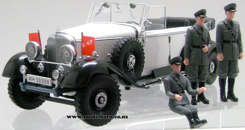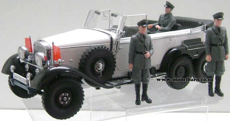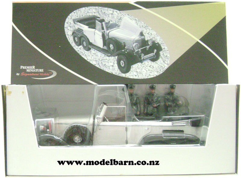 1/18 Mercedes-Benz G4 Command Car 1938. Made by Signature Models as part of their "Premier Signature" range. Decorated in "White" livery & features left-hand drive, steerable front wheels, opening doors, opening bonnet, detailed engine, opening boot, very nice detail. This is a used item in very good condition but may have minor imperfections. Its box is in good condition but has marks, tears & creases. Only 1 available. Comes with 3 Wehrmacht soldiers. This vehicle is 302mm long, 108mm wide & 108mm high.