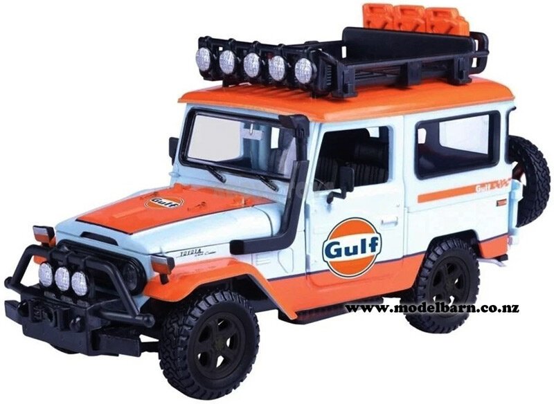 1/24 Toyota FJ40 Land Cruiser Vehicle. Made by Motor Max as part of their "Gulf" series. Features left-hand drive, opening doors, opening bonnet, detailed engine, nice detail. This vehicle is 174mm long, 79mm wide & 100mm high.This item is not suitable for children under 8.