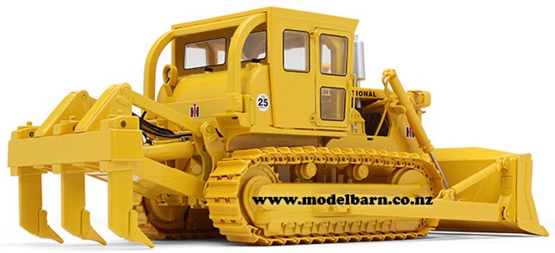 1/25 International Harvester TD-25 Bulldozer with Ripper. Made by First Gear. Features rolling metal tracks, movable blade, movable rippers, opening cab door, precision detail. Comes with a copy of its original operators manual. This bulldozer is 333mm long, 154mm wide & 132mm high.