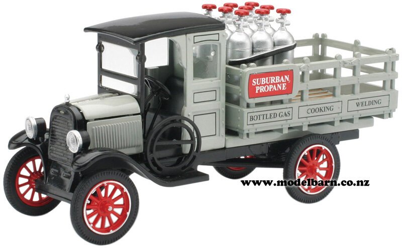 1/32 Chevrolet Type D 1-Ton Stake Truck 1923. Made by NewRay. Decorated in "Suburban Propane" livery & features left-hand drive, opening bonnet, detailed engine, nice detail. This vehicle is 148mm long, 51mm wide & 73mm high & comes on a plinth.