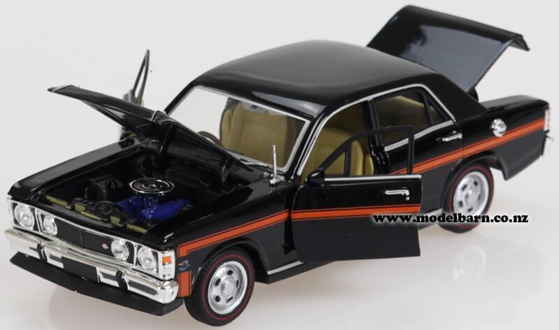 1/32 Ford XW Falcon GTHO Phase II Car. Made by DDA Collectibles Australia. Decorated in "Black" livery & features right-hand drive, steerable front wheels (not recommended though as the steering is fragile), opening doors, opening bonnet, detailed Cleveland 351 V8 engine, detailed interior, opening boot, very nice detail. This vehicle is 146mm long, 57mm wide & 46mm high.This item is not suitable for children.