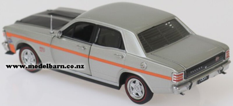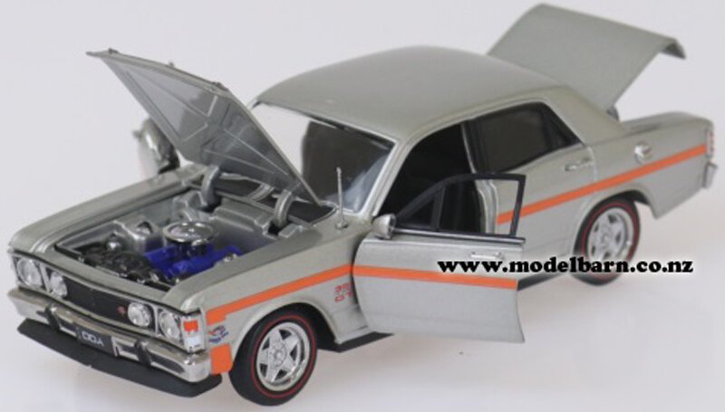 1/32 Ford XW Falcon GTHO Phase II Car. Made by DDA Collectibles Australia. Decorated in "Silver Fox" livery & features right-hand drive, steerable front wheels (not recommended though as the steering is fragile), opening doors, opening bonnet, detailed Cleveland 351 V8 engine, detailed interior, opening boot, very nice detail. This vehicle is 146mm long, 57mm wide & 46mm high.This item is not suitable for children.