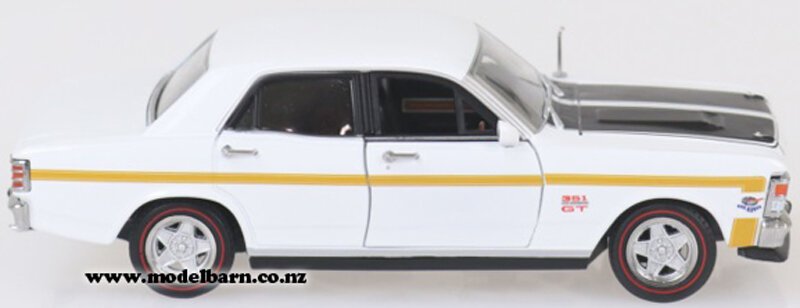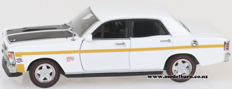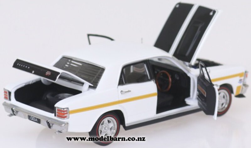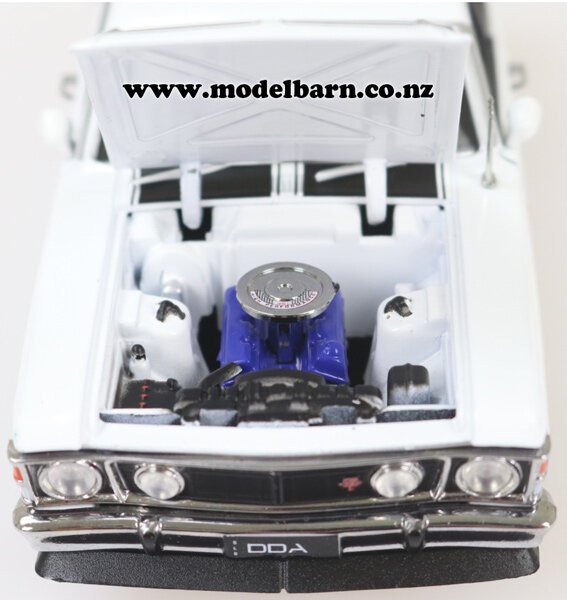 1/32 Ford XW Falcon GTHO Phase II Car. Made by DDA Collectibles Australia. Decorated in "White" livery & features right-hand drive, steerable front wheels (not recommended though as the steering is fragile), opening doors, opening bonnet, detailed Cleveland 351 V8 engine, detailed interior, opening boot, very nice detail. This vehicle is 146mm long, 57mm wide & 46mm high.This item is not suitable for children.