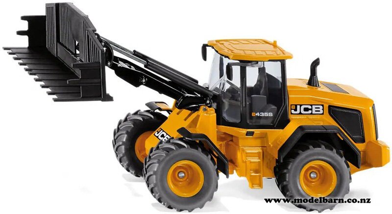 1/32 JCB 435S Agri Wheel Loader. Made by Siku. Features pivot steering, retractable mirrors, movable arms & tipping bucket, detachable bucket. Attaches to selected 1/32 trailers. The bucket is made of plastic & care must be taken when detaching it from the hitch. This wheel loader is 245mm long, 130mm wide & 170mm high (when fully extended).