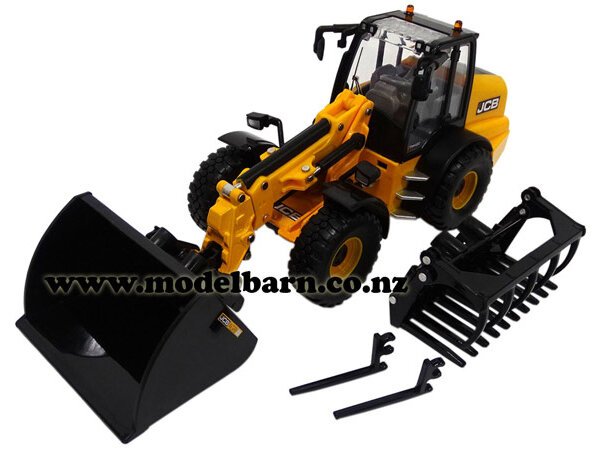 1/32 JCB TM420 Telescopic Wheel Loader. Made by Britains. Features pivot steering, telescopic arm, movable arms & tipping bucket, interchangeable attachments. Comes with bucket, silage grab & pallet forks. This wheel loader is 295mm long, 75mm wide & 215mm high (when fully extended).