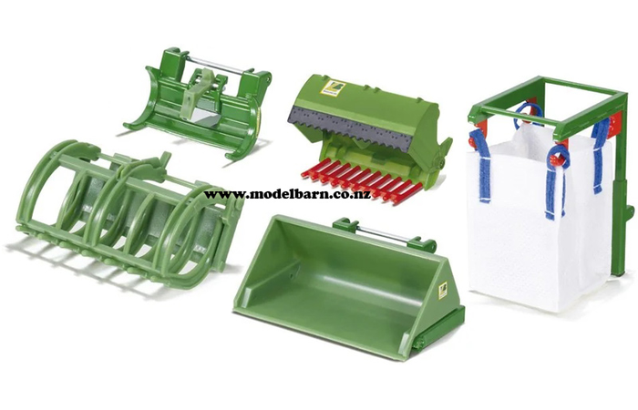 1/32 Front-End Loader Accessories Set. Made by Siku. Features 5 attachments: silage cutter, log grab, brush pile grab, bucket, big bag carrier. Attaches only to 1/32 Siku Tractors with Loaders (with detachable bucket).