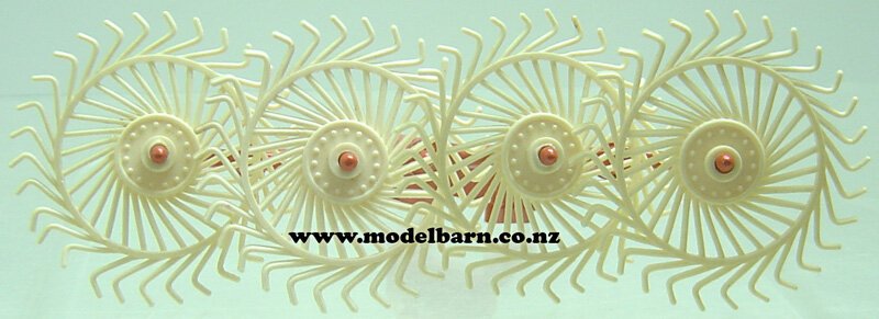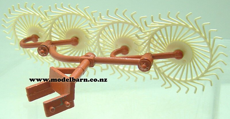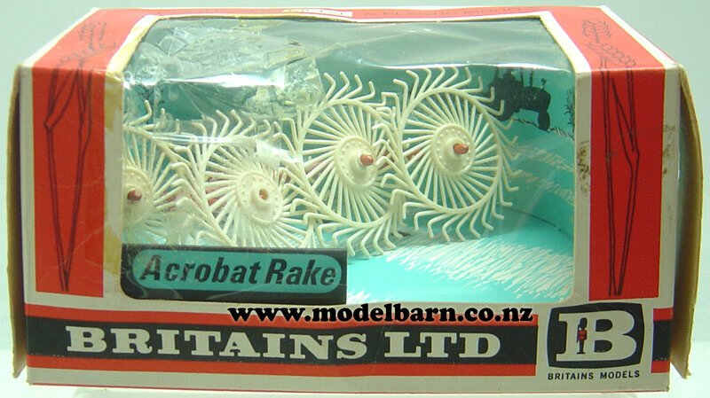 1/32 Vicon Acrobat Rake. Made by Britains in the 1970s. Features rotating rakes & frames. Attaches to most 1/32 tractors. This is a used item in good condition but does have marks & blemishes & may have other small imperfections. Its box is in rough condition with tears, marks & damage to the cellophane. Only 1 available. This hay rake is 55mm long, 105mm wide & 40mm high.