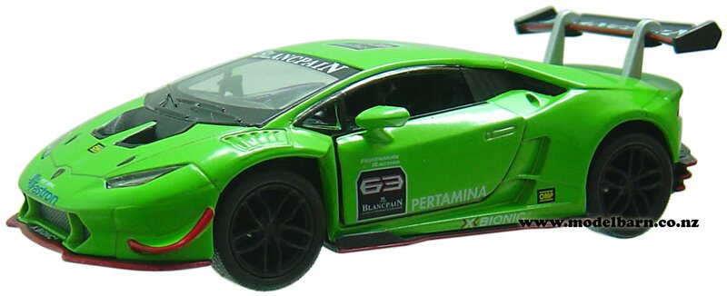 1/36 Lamborghini Huracan LP620-2 Super Trofeo Race Car. Made by Kinsmart. Features left-hand drive, opening doors, pull back action. This vehicle is 127mm long, 59mm wide & 37mm high.This item is not suitable for children under 5.