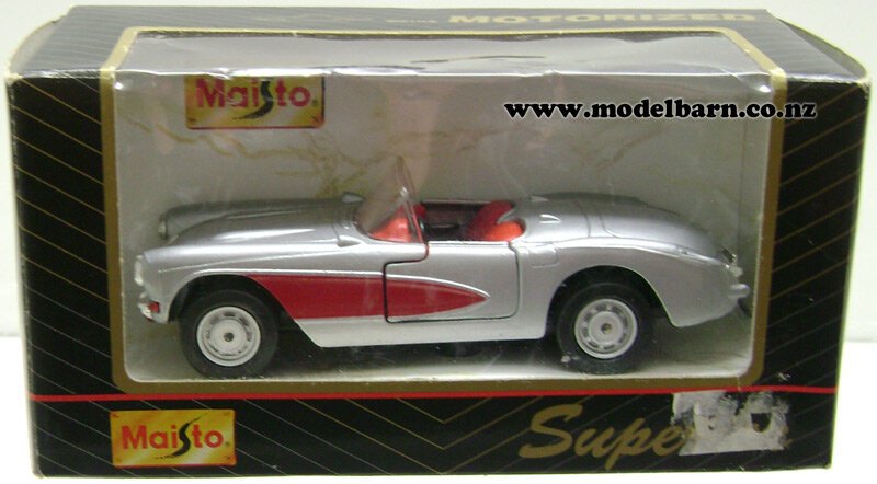 1/39 Chevrolet Corvette Car 1957. Made by Maisto. Decorated in "Silver & Red" livery & features left-hand drive, opening doors, good detail. This is a used item in good condition but may have some imperfections. Its box is in good condition but does have some marks, blemishes, creases & tears. Only 1 available. This vehicle is 114mm long, 47mm wide & 33mm high.