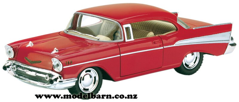 1/40 Chevrolet Bel Air Coupe Car 1957. Made by Kinsmart. Features left-hand drive, opening doors, pull back action. This vehicle is 127mm long, 49mm wide & 37mm high.