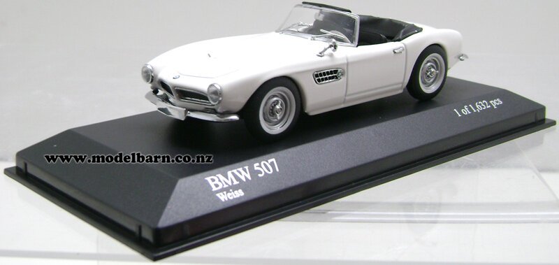 1/43 BMW 507 Cabriolet Car 1956. Made by Minichamps. Decorated in "White" livery & features left-hand drive, very nice detail. This is a used item in good condition but may have small imperfections. Its box is in good condition but does have some marks, blemishes & creases. Only 1632 have been made of this limited edition. Only 1 available. This vehicle is 103mm long, 39mm wide & 28mm high & comes in a display case.This item is not suitable for children.
