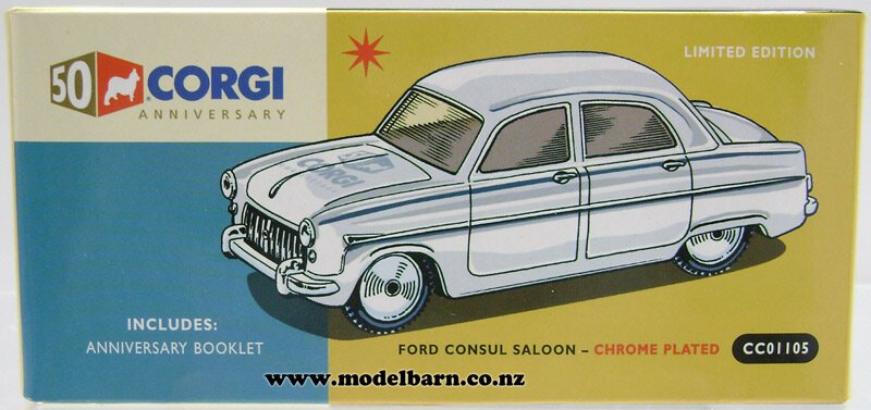 1/46 Ford Consul Sedan Car. Made by Corgi in 2006 to commemorate 50 Years of Corgi from 1956 - 2006. Decorated in "Chrome Plated" livery & features nice detail. This is a used item in very good condition but may have small imperfections. Its box is in good condition but does have some marks & blemishes. Only 650 have been made of this limited edition. Only 1 available. Comes with collector's certificate. This vehicle is 89mm long, 32mm wide & 33mm high.