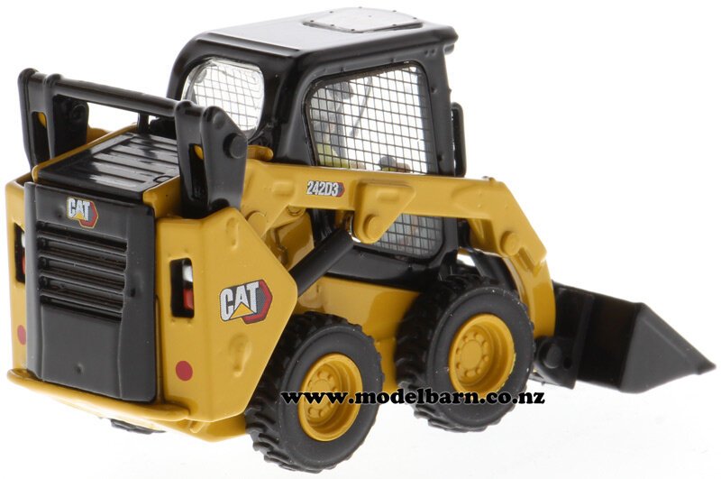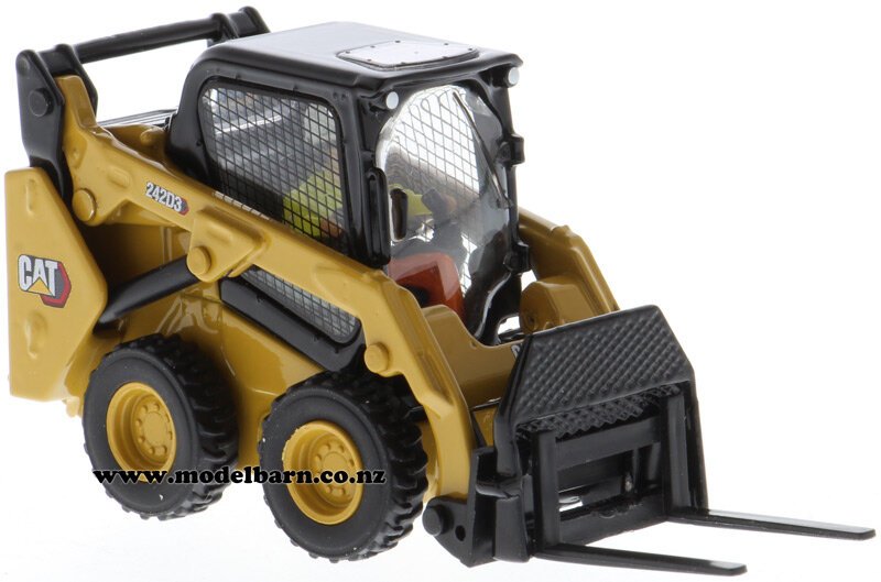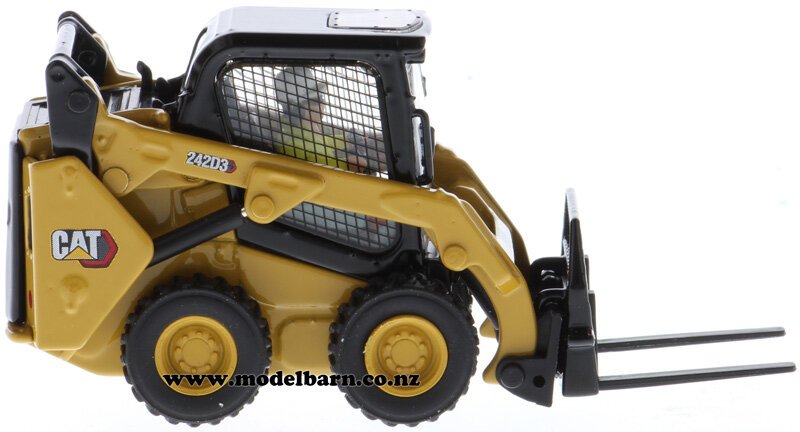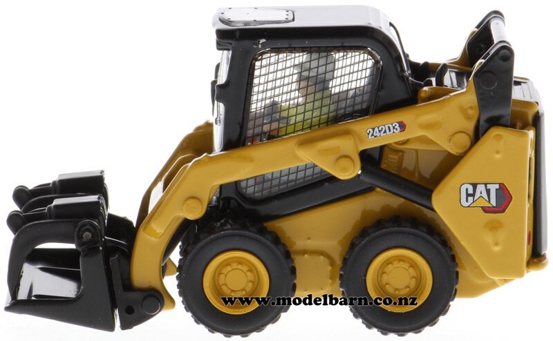 1/50 Caterpillar 242D3 Skid Steer Loader. Made by Diecast Masters as part of their "High Line" series. Features movable arms & tipping bucket, interchangeable attachments, very nice detail. Comes with bucket, grapple & pallet forks. Comes with operator in the cab. This skid steer loader is 73mm long, 29mm wide & 65mm high (when fully extended).This item is not suitable for children.