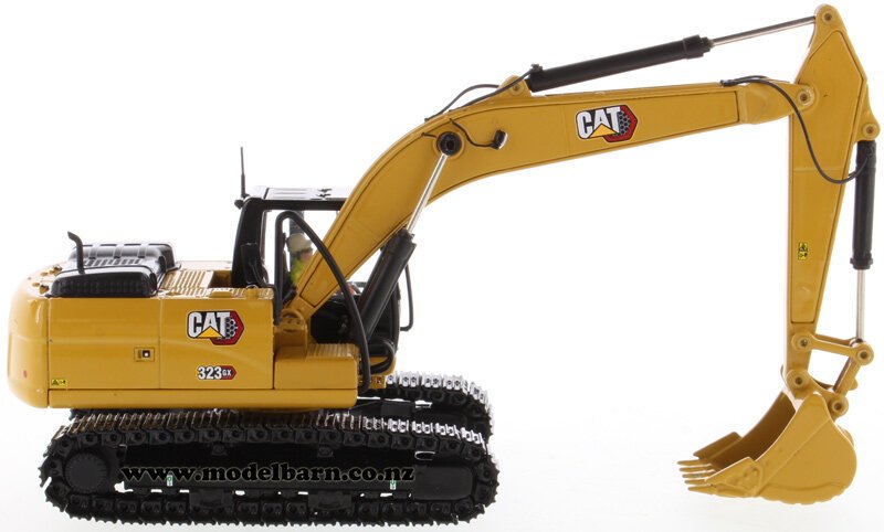 1/50 Caterpillar 323 GX Excavator. Made by Diecast Masters as part of their "High Line" series. Features rolling metal tracks, movable arms & tipping bucket, rotating cab, nice detail. Comes with separate operator which can be placed in the cab. This excavator is 250mm long, 64mm wide & 200mm high (when fully extended).