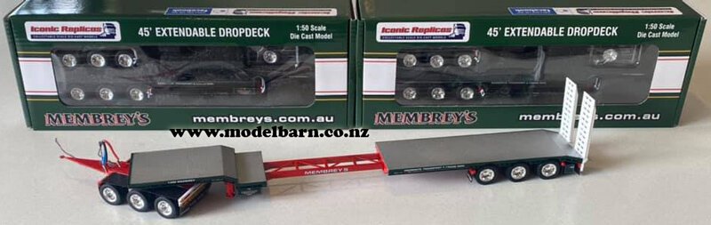 1/50 CTE (Custom Transport Equipment) 3-Axle Dolly & 3-Axle Drop Deck Low Loader Trailer. Made by Iconic Replicas Ltd Australia. Decorated in "Membrey's Transport & Crane Hire" livery, & features detachable dolly, extendable low bed, functioning ramps for loading & unloading, functioning legs, precision detail. Attaches to most 1/50 prime movers. This set is 453mm long, 51mm wide, & 76mm high (when fully extended).
