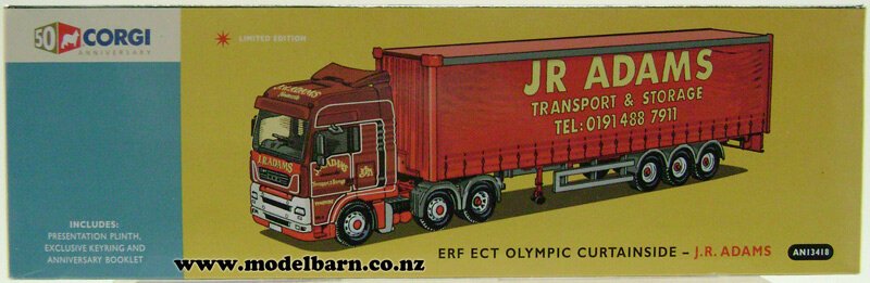 1/50 ERF ECT Olympic Prime Mover Truck & Semi Curtainside Trailer. Made by Corgi in 2006 to commemorate Corgi's 50th anniversary. Decorated in "JR Adams" livery & features right-hand drive, detachable trailer, very nice detail. This is a used item in good condition but may have small imperfections. The box is in good condition but has marks & creases. Only 2006 have been made of this limited edition. Only 1 available. The mirrors are included in the package & a 50th anniversary Corgi keyring. Comes with collector's certificate. This set is 340mm long, 52mm wide & 85mm high.