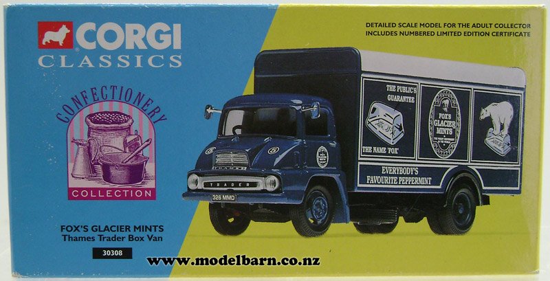 1/50 Ford Thames Trader Box Truck. Made by Corgi in 1997 as part of their "Corgi Classics" series. Decorated in "Fox's Glacier Mints" livery & features right-hand drive, nice detail. This is a used item in very good condition but may have some tiny imperfections. Its box is in good condition but has some marks & blemishes. Only 4300 have been made of this limited edition. Only 1 available. The mirrors are included in the package. Comes with collector's certificate. This truck is 138mm long, 44mm wide & 61mm high.This item is not suitable for children.