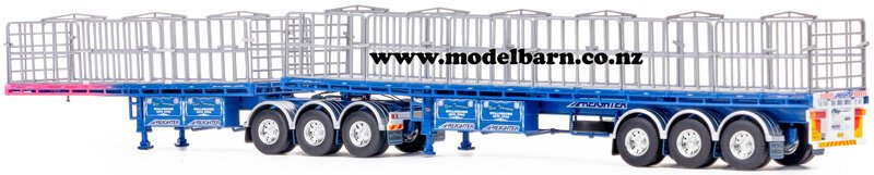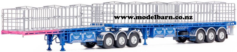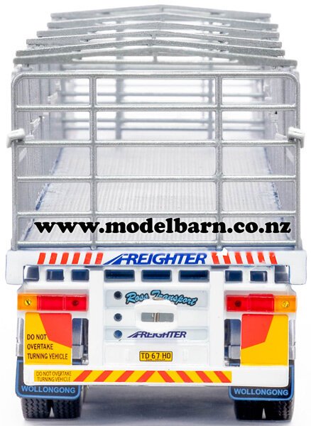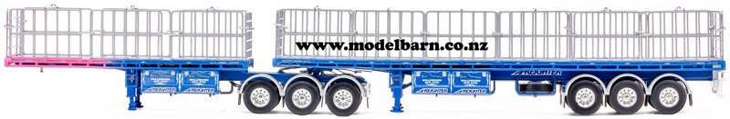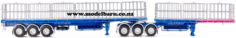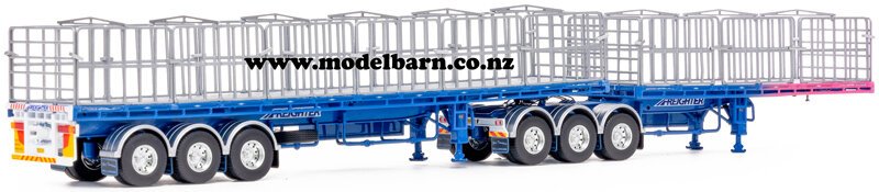 1/50 Freighter Flat Top B-Double Trailer Set. Made by Drake Collectibles. Decorated in "Ross Transport" livery, & features adjustable stands, removable steel gates, detachable rear trailer, very nice detail. Attaches to most 1/50 prime movers. This set is 433mm long, 48mm wide, & 65mm high. This item is not suitable for children.