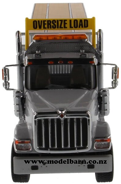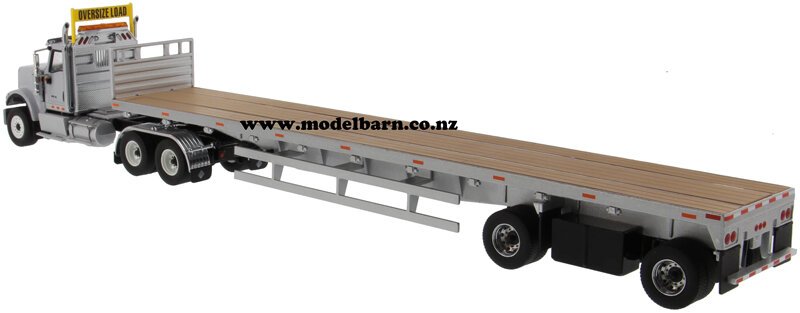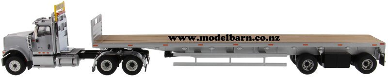 1/50 International HX520 Prime Mover Truck with 53' Semi Flat Deck Trailer. Made by Diecast Masters as part of their "Transport" series. Decorated in "Grey" livery & features left-hand drive, steerable front wheels, opening bonnet, detailed Cummins X15 engine, detachable trailer, nice detail. This set is 414mm long, 62mm wide & 80mm high.