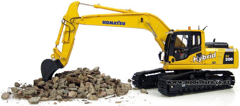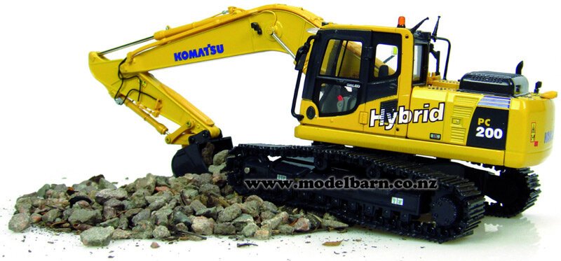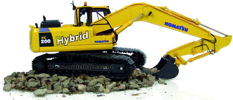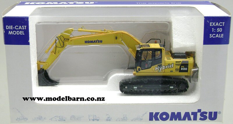 1/50 Komatsu PC200-8 Hybrid Excavator. Made by Universal Hobbies. Features metal tracks, movable arms & tipping bucket, rotating cab, precision detail. Only 1 available. This excavator is 230mm long, 60mm wide & 155mm high (when fully extended).This item is not suitable for children.This item is new. Its box is showing signs of wear.