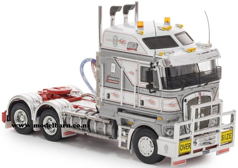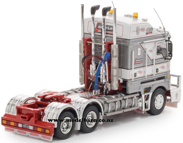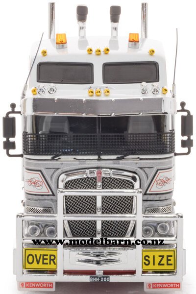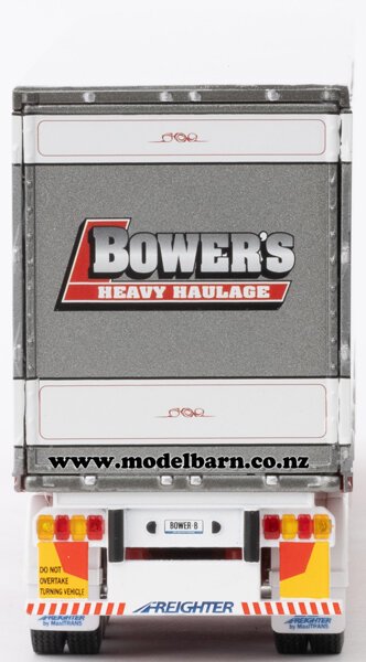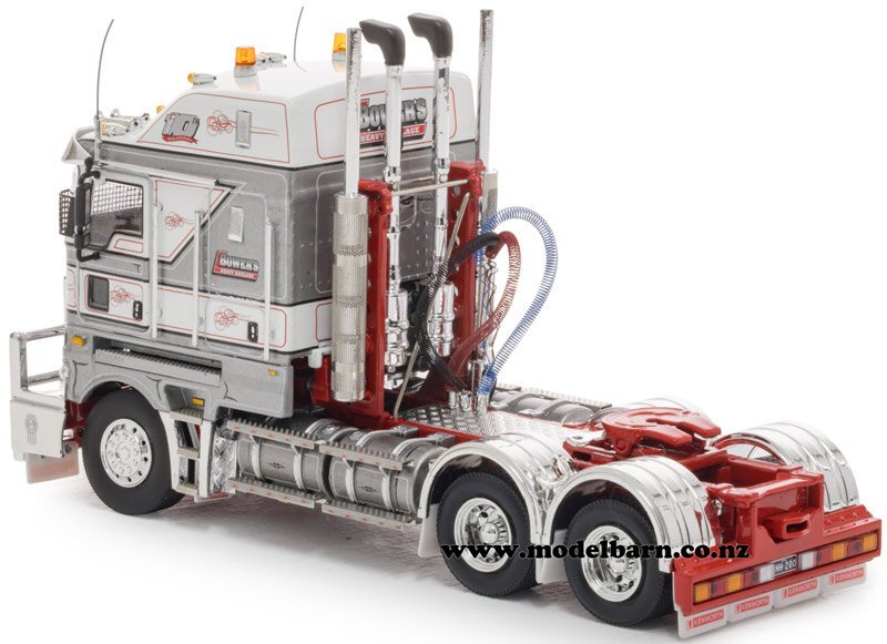 Bower's Heavy Haulage" livery. Combo contains; 1/50 Kenworth K200 & 1/50 Freighter Eziliner B-Double Trailer Set. Prime mover features 2.8m cab, right-hand drive, steerable front wheels, opening doors, tilting cab, detailed engine, functioning rear suspension, stone grill, twin exhausts, twin air cleaners, precision detail. Trailer features detachable rear trailer, very nice detail.