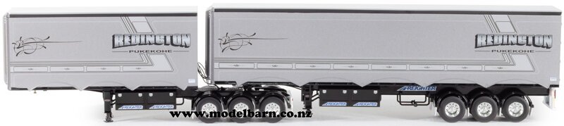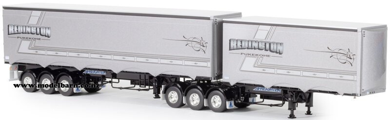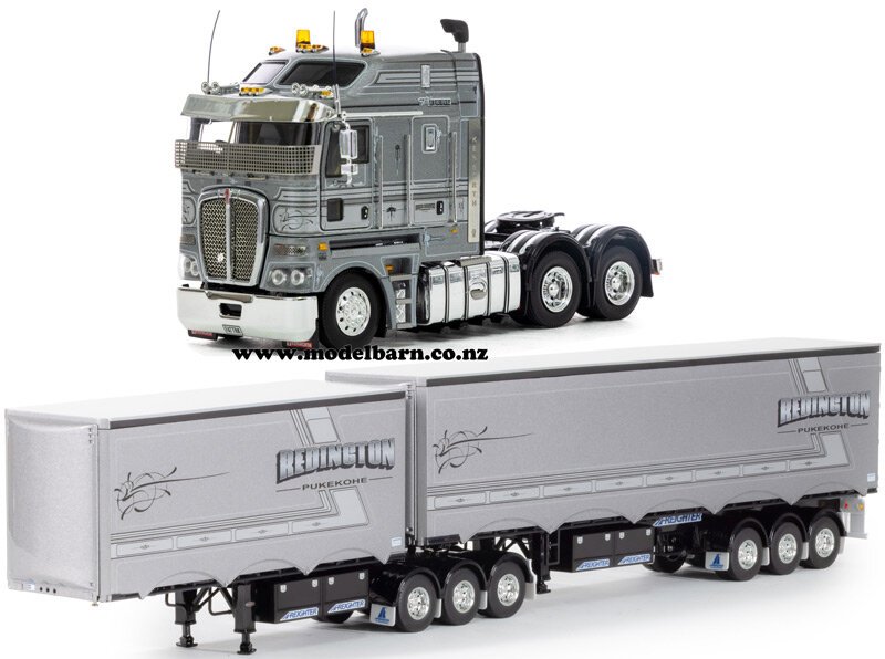 Northchill/Redington" livery. Combo contains; 1/50 Kenworth K200 & 1/50 Freighter Eziliner B-Double Trailer Set. Prime mover features 2.8m cab, right-hand drive, steerable front wheels, opening doors, tilting cab, detailed engine, functioning rear suspension, precision detail. Trailer features detachable rear trailer, very nice detail.