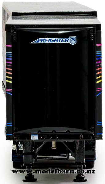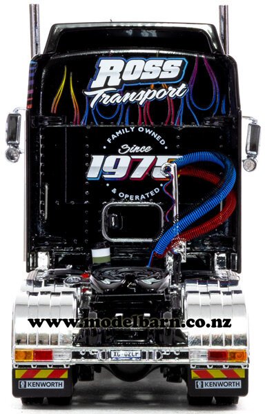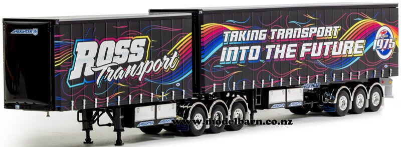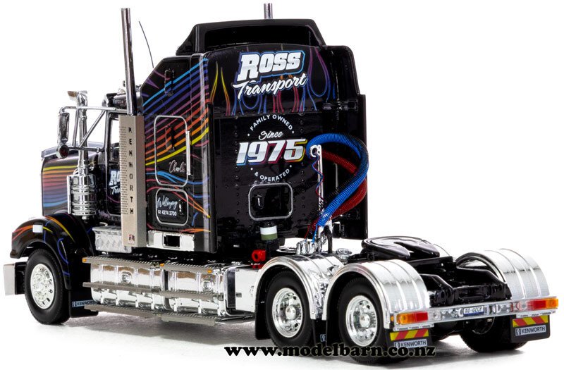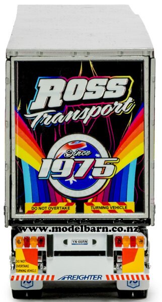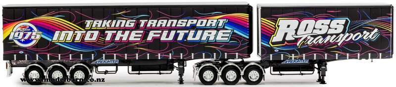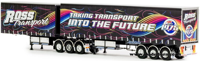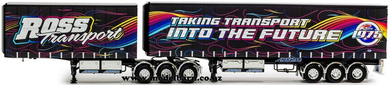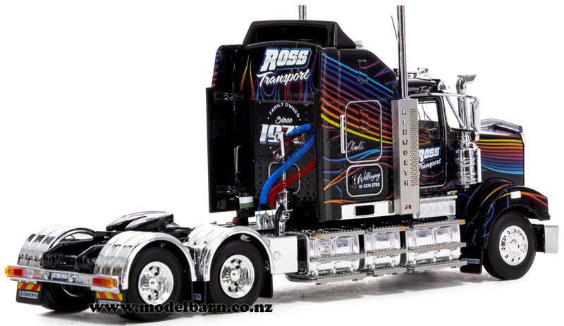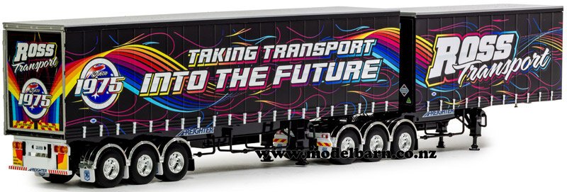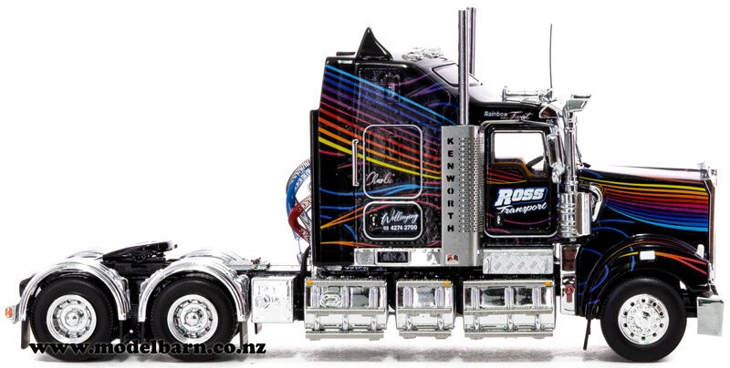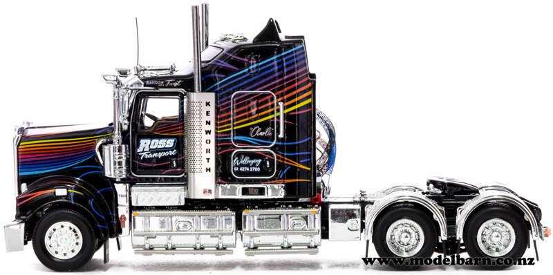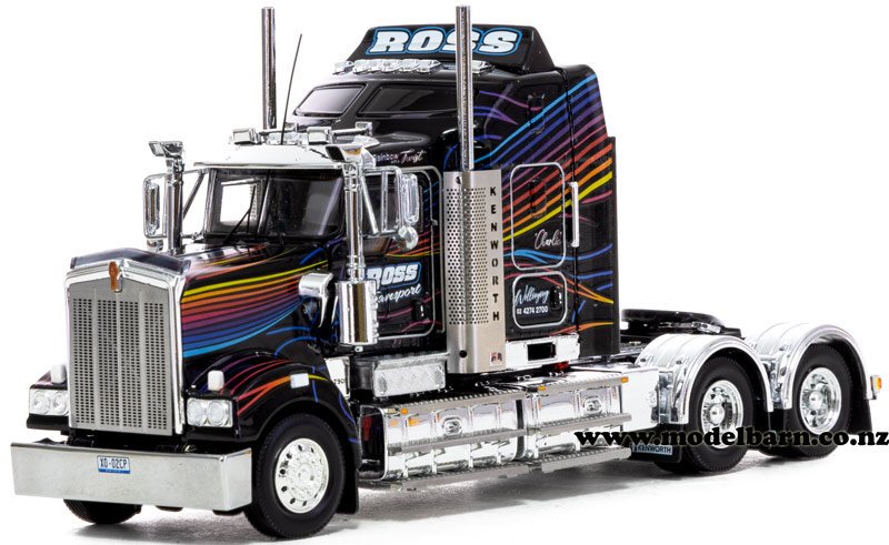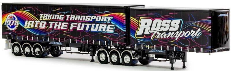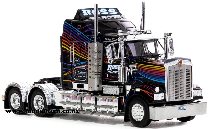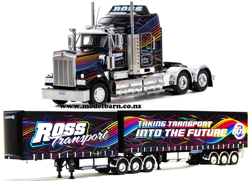1/50 Kenworth T909 Prime Mover Truck & Freighter Tautliner B-Double Trailer Set Combo. Made by Drake Collectibles. Decorated in "Ross Transport" livery. Combo contains; 1/50 Kenworth T909 & 1/50 Freighter Tautliner B-Double Trailer Set. Features right-hand drive, steerable front wheels (not recommended though as the steering is fragile), opening doors, opening bonnet, detailed engine, detachable trailers, precision detail. Only 750 have been made in this "Ross Transport Rainbow" livery. Only 1 available. Comes with Certificate of Authenticity. This truck & trailer combo set is 965mm long, 55mm wide, & 94mm high approximately. This item is not suitable for children.This is a special combo consisting of Drake-01587 & Drake-09287.Special Combo price is $749.50.