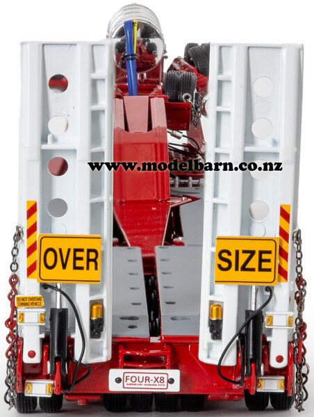 1/50 Kenworth T909 Prime Mover Truck with Drake 2x8 Dolly & 4x8 Swingwing Low Loader Trailer Combo. Made by Drake Collectibles. Decorated in "Rosso Red" livery. Features right-hand drive, steerable front wheels (not recommended though as the steering is fragile), opening doors, opening bonnet, detailed engine, detachable trailer, detachable dolly, expandable low bed, functioning ramps for loading & unloading, precision detail. This truck & trailer combo set is 584mm long, 87mm wide, & 76mm high (when fully extended).