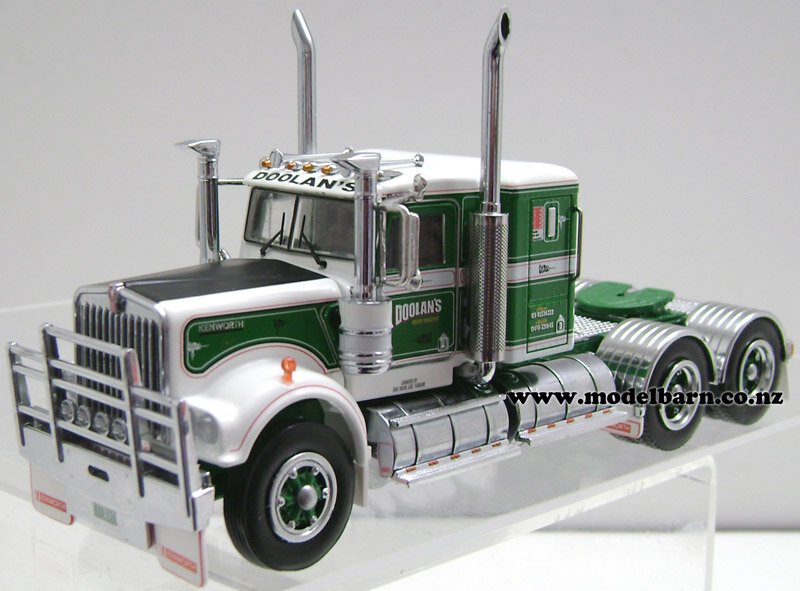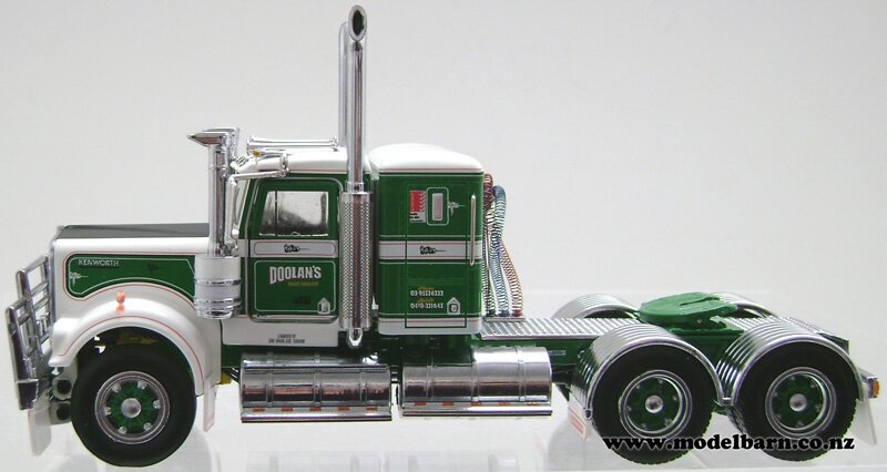 1/50 Kenworth W900 Flat Top Prime Mover Truck. Made by Iconic Replicas Ltd Australia. Decorated in "Doolans Heavy Haulage" livery & features spider wheels, right-hand drive, steerable front wheels, opening bonnet, detailed engine, tilting bullbar, very nice detail. Attaches to most 1/50 semi trailers. Only 650 have been made of this limited edition. Comes with Certificate of Authenticity. This truck is 155mm long, 54mm wide & 81mm high.This item is not suitable for children.There is a limit of 1 per customer on this item. Please do not attempt to order more than 1. Any customer ordering more than 1 will have their order cancelled.