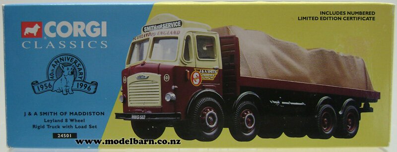1/50 Leyland 4-Axle Flatdeck Truck with Load. Made by Corgi in 1995 as part of their "Corgi Classics" series. Decorated in "J & A Smith of Maddiston" livery & features right-hand drive, nice detail. This is a used item in very good condition but may have some tiny imperfections. Its box is in good condition but has some marks & blemishes. Only 12,300 have been made of this limited edition. Only 1 available. Comes with collector's certificate. This truck is 187mm long, 48mm wide & 63mm high.This item is not suitable for children.