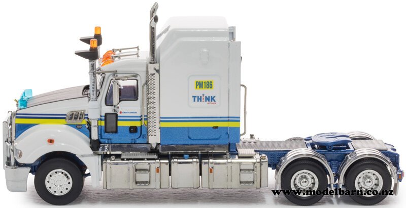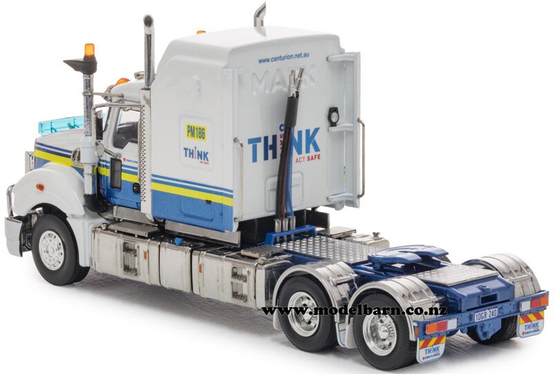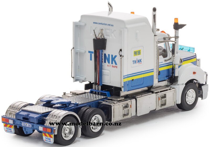 1/50 Mack Super-Liner III Prime Mover Truck. Made by Drake Collectibles. Decorated in "Centurion Transport" livery. Features right-hand drive, steerable front wheels (not recommended though as the steering is fragile), opening doors, opening bonnet, detailed engine, opening bullbar, precision detail. Attaches to most 1/50 semi-trailers. This prime mover is 172mm long, 58mm wide, & 83mm high.