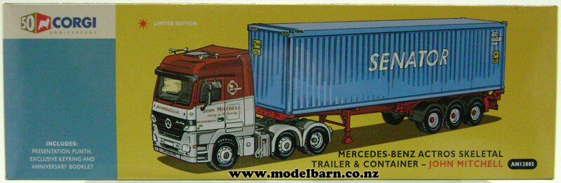 1/50 Mercedes-Benz Actros Prime Mover Truck & skeletal Trailer & Container. Made by Corgi in 2006 to commemorate Corgi's 50th anniversary. Decorated in "John Mitchell" livery & features right-hand drive, detachable trailer, removable container, telescopic trailer, very nice detail. This is a used item in good condition but may have small imperfections. Its sunvisor has broken off & needs regluing. The box is in good condition but has marks & creases. Only 2006 have been made of this limited edition. Only 1 available. The mirrors are included in the package & a 50th anniversary Corgi keyring. Comes with collector's certificate. This set is 322mm long, 52mm wide & 87mm high.