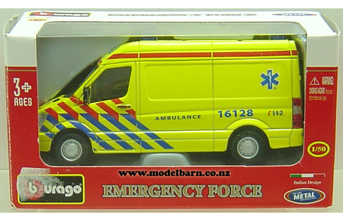 1/50 Mercedes-Benz Sprinter Ambulance. Made by Bburago. Features left-hand drive, good detail. This is a used item in good condition but may have some imperfections. Its box is in good condition but has dirty spots, creases & marks. Only 1 available. This vehicle is 123mm long, 46mm wide & 58mm high.