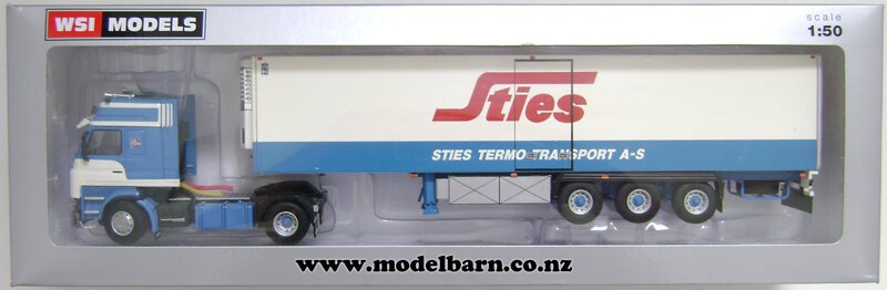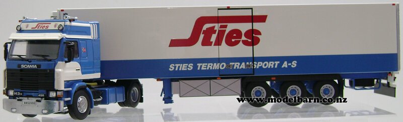 1/50 Scania 143M Prime Mover Truck & Semi Refer Trailer. Made by WSI Models. Decorated in "Sties Transport" livery. Features left-hand drive, steerable front wheels, tilting cab, detailed engine, detachable trailer, very nice detail. This is a used item in good condition but may have small imperfections. The box is in good condition & has some marks & creases. Only 1 available. This set is 339mm long, 60mm wide, & 80mm high.This item is not suitable for children.