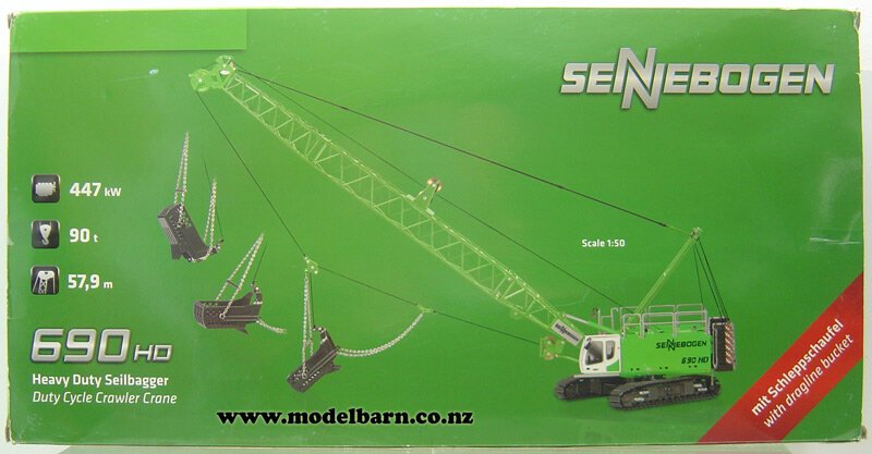 1/50 Sennebogen 690HD Dragline Excavator. Made by ROS. Features opening door, rolling metal tracks, movable arms & tipping bucket, rotating cab. The boom & bucket can be controlled using the special tool provided. Comes fully rigged. This is a used item in very good condition but may have some small imperfections. The box is in fair condition & has some marks, creases & some crushing. Only 1 available. This dragline is 615mm long, 75mm wide & 270mm high.This item is not suitable for children.