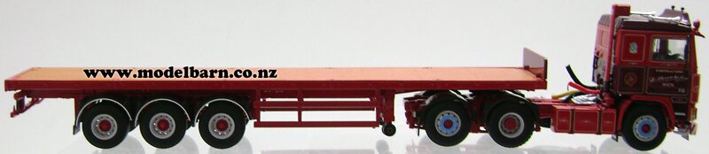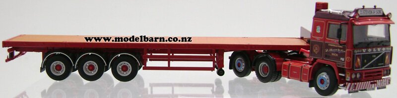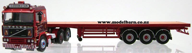 1/50 Volvo F12 Prime Mover Truck & 3-Axle Semi Flatdeck Trailer. Made by WSI Models. Decorated in "D Steven & Son" livery. Features left-hand drive, steerable front wheels, tilting cab, detailed engine, lazy rear axle, detachabe trailer, very nice detail. This is a used item in very good condition but may have small imperfections. The box is in good condition & has some marks & creases. Only 330 have been made of this limited edition. Only 1 available. Comes with Certificate of Authenticity. This set is 328mm long, 57mm wide, & 67mm high.This item is not suitable for children.