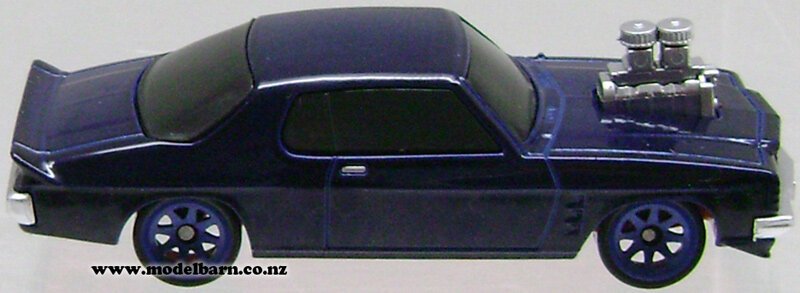 1/64 Holden HX LE Coupe Car. Made by Oz Wheels as part of their "Redbellies" range. Decorated in "Dark Blue" livery & features a blown engine, nice detail. This vehicle is 74mm long, 29mm wide & 22mm high.This item is not suitable for children under 5.