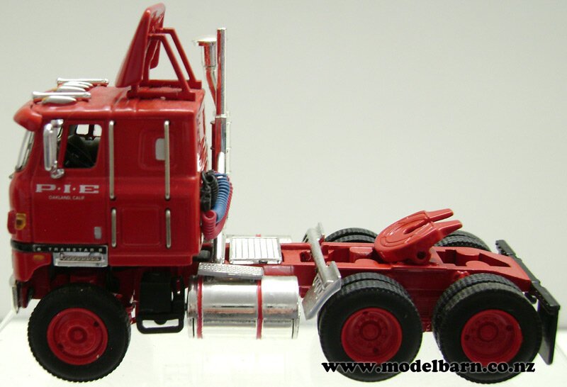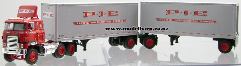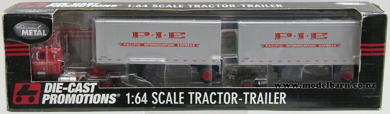 1/64 International Transtar Prime Mover Truck with 2 Box Trailers. Made by Die-Cast Promotions in 2007. Decorated in "Pacific Intermountain Express" livery, & features features left-hand drive, detachable trailers, opening rear trailer doors, nice detail. This is a used item in good condition but may have some imperfections. Its box is in good condition but does have some marks, blemishes & creases. Only 1 available. This set is 343mm long, 44mm wide & 67mm high.This item is not suitable for children.