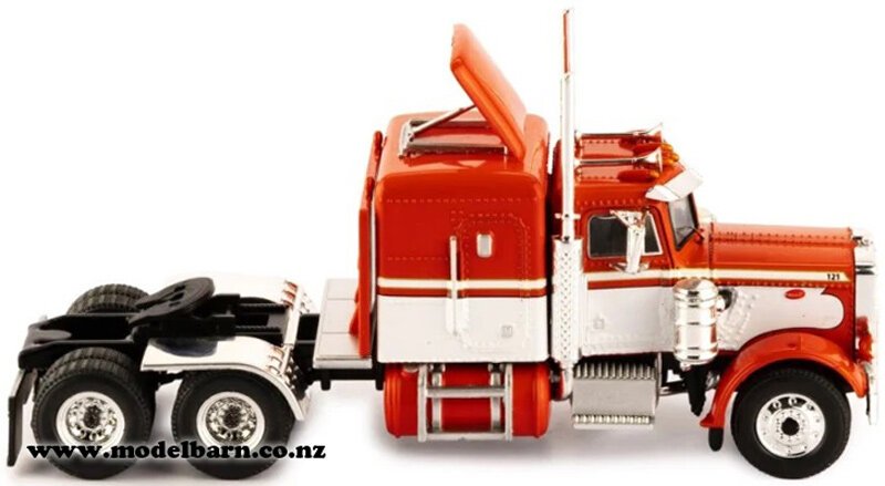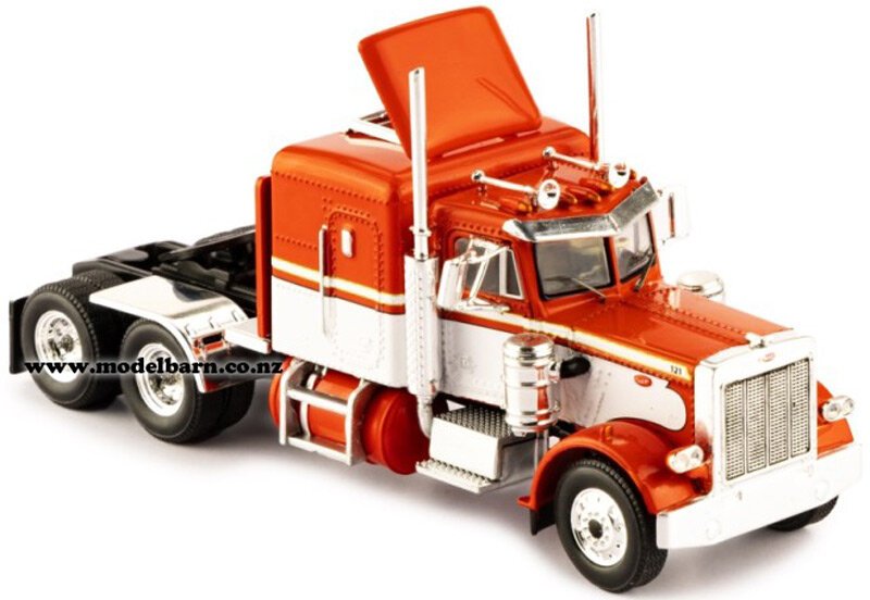 1/64 Peterbilt 359 Prime Mover Truck 1973. Made by IXO Models. Decorated in "Red & White" livery & features left-hand drive, very nice detail. Attaches to most 1/64 semi trailers. This truck is 131mm long, 43mm wide & 63mm high & comes in a display case.This item is not suitable for children.