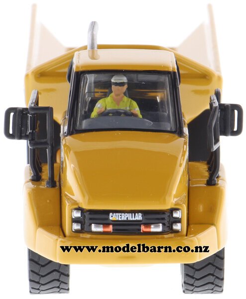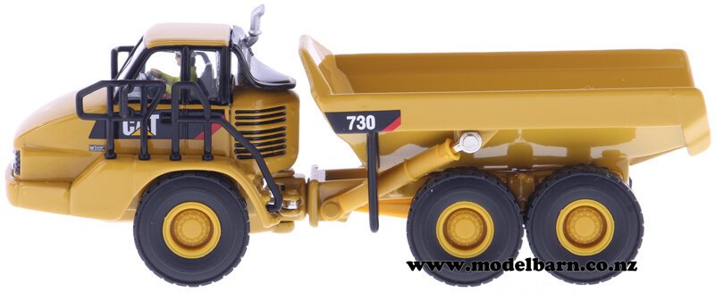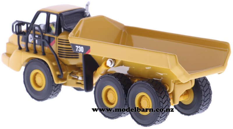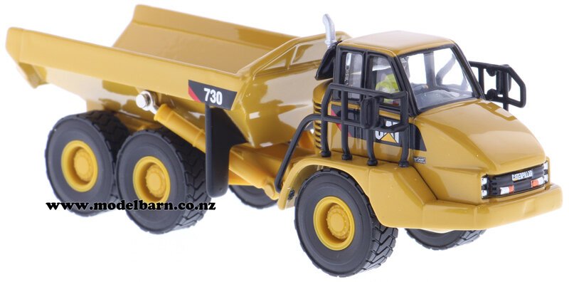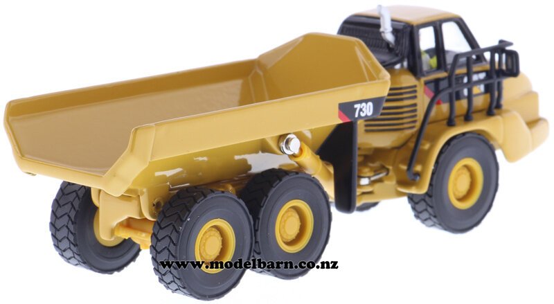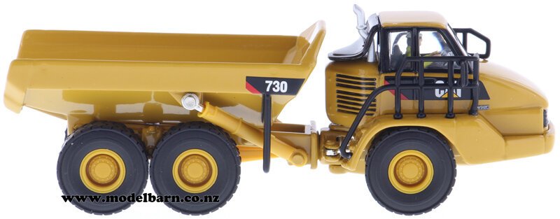 1/87 Caterpillar 730 Articulated Dump Truck. Made by Diecast Masters as part of their "High Line" series. Features pivot steering, tipping body, nice detail. Comes with operator in the cab. This dump truck is 120mm long, 35mm wide & 63mm high (when fully extended).