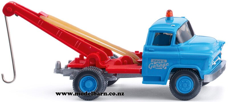 1/87 Chevrolet 2-Axle Tow Truck 1955. Made by Wiking. Decorated in "Dave's Garage" livery & features left-hand drive, precision detail. This truck is made of plastic & is 75mm long, 28mm wide & 30mm high.This item is not suitable for children.