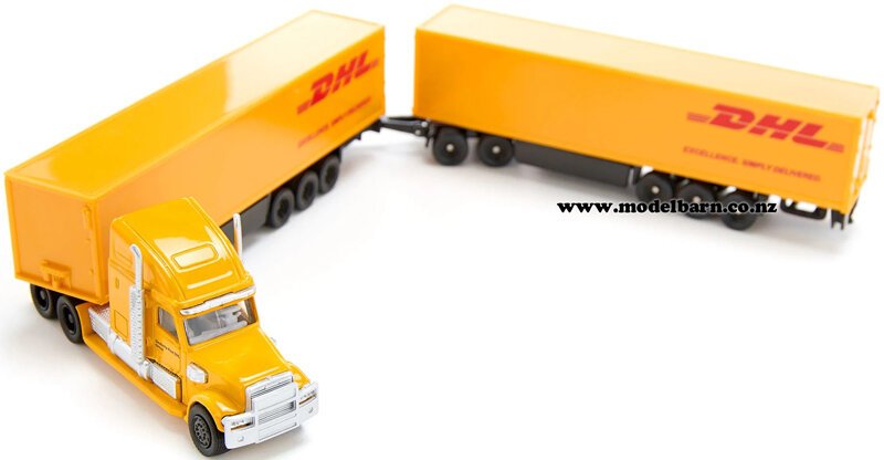 1/87 Freightliner Prime Mover Truck & 2 Trailers. Made by Siku. Decorated in "DHL" livery & features detachable trailers, opening rear doors, good detail. This set is 400mm long, 28mm wide & 48mm high.