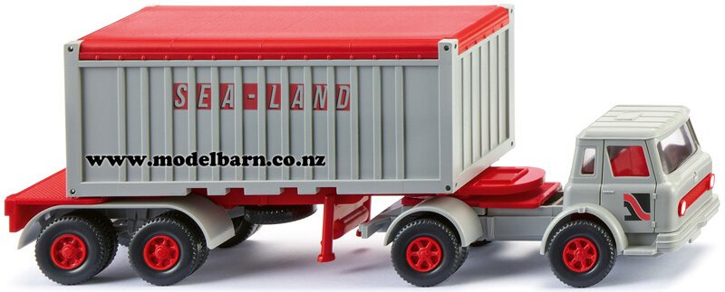 1/87 International Loadstar Prime Mover Truck & Semi Container Trailer. Made by Wiking. Decorated in "Sealand" livery & features left-hand drive, removable 20' container, detachable trailer, precision detail. This set is made of plastic & is 118mm long, 28mm wide & 43mm high.