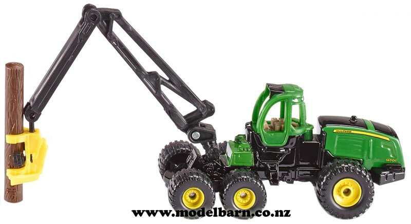 1/87 John Deere 1470E Tree Harvester. Made by Siku. Features movable arms & head. Comes with 6 plastic logs. This harvester is 200mm long, 150mm high, & 33mm wide (when fully extended).