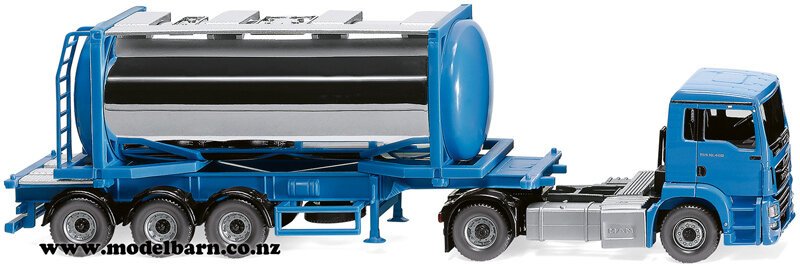 1/87 MAN TGS 18.400 Prime Mover Truck & Semi Tank Container Trailer. Made by Wiking. Decorated in "Sky Blue" livery & features left-hand drive, detachable trailer, precision detail. This set is made of plastic & is 154mm long, 28mm wide & 46mm high.This item is not suitable for children.