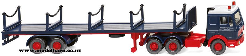 1/87 Mercedes-Benz 3850 Prime Mover Truck & Semi Stanchion Flat Deck Trailer. Made by Wiking. Decorated in "Rheinkraft" livery & features left-hand drive, detachable trailer, precision detail. This set is made of plastic & is 175mm long, 26mm wide & 37mm high.This item is not suitable for children.